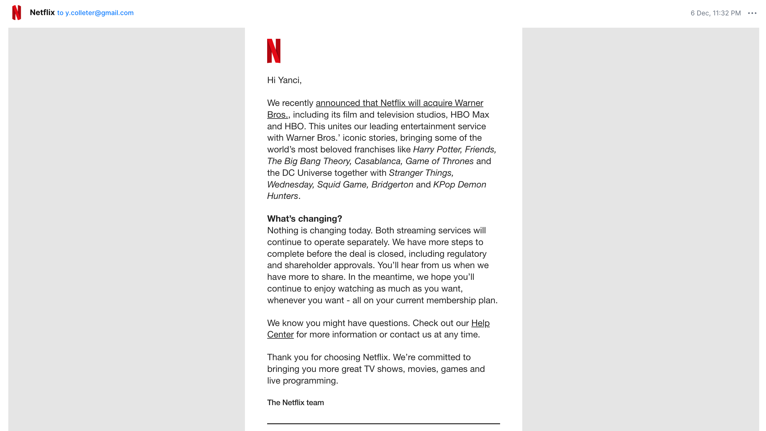 On December 6, Netflix emailed its entire subscriber base to “explain” the deal, plus shared a full FAQ on its website.