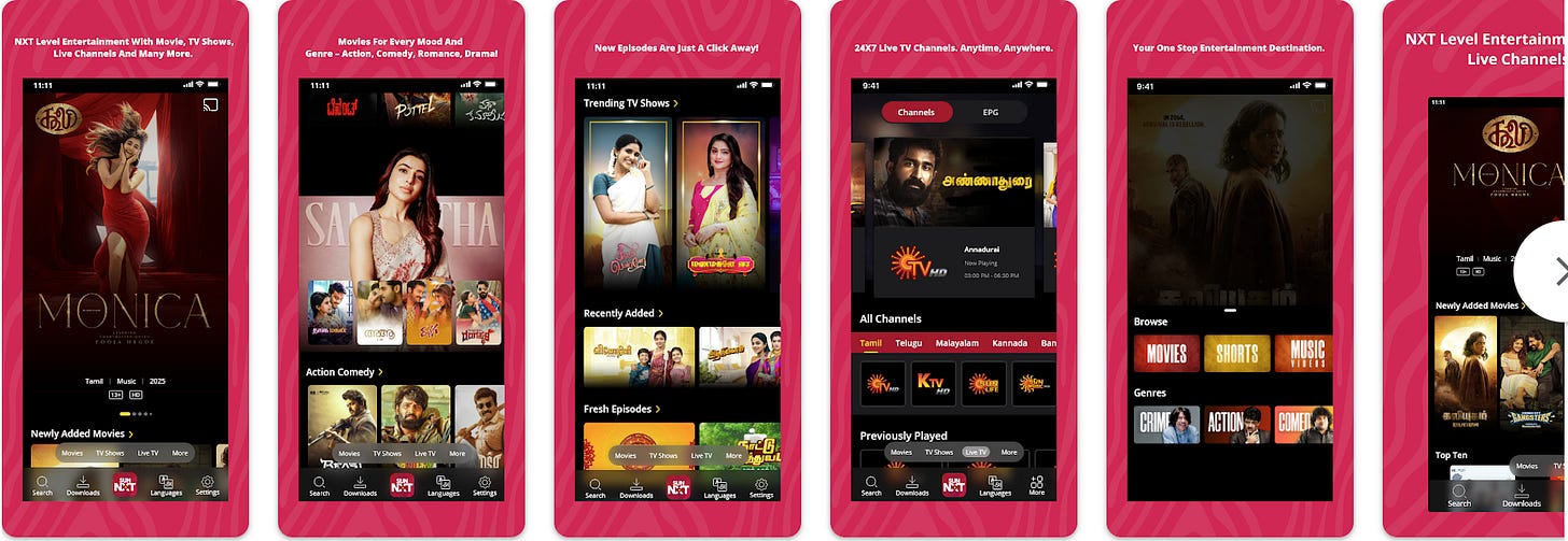The content strategy for SunNXT has been more about breadth and catch-up TV than high-end originals. Subscribers (paid users) get ad-free access to SunNXT’s entire catalog, including live TV streams and catch-up episodes of shows that air on Sun’s channels (often available immediately after TV broadcast). This “tap into TV audience” strategy turned SunNXT into a must-have for soap opera fans who could watch missed episodes or even live television on mobile. In addition, SunNXT has a rich film library – especially Tamil hits, given Sun’s film distribution arm (Sun Pictures) which produces big Tamil films. The platform does have some originals and exclusive premieres, but on a much smaller scale than Hoichoi or Aha. Instead, SunNXT’s differentiator is leveraging its parent network’s strengths: for instance, Sun TV produces made-for-TV movies and then directly secures their digital rights for SunNXT, saving costs on content acquisition. This vertical integration (TV + movies + OTT) gives SunNXT a steady flow of content without huge extra investment.