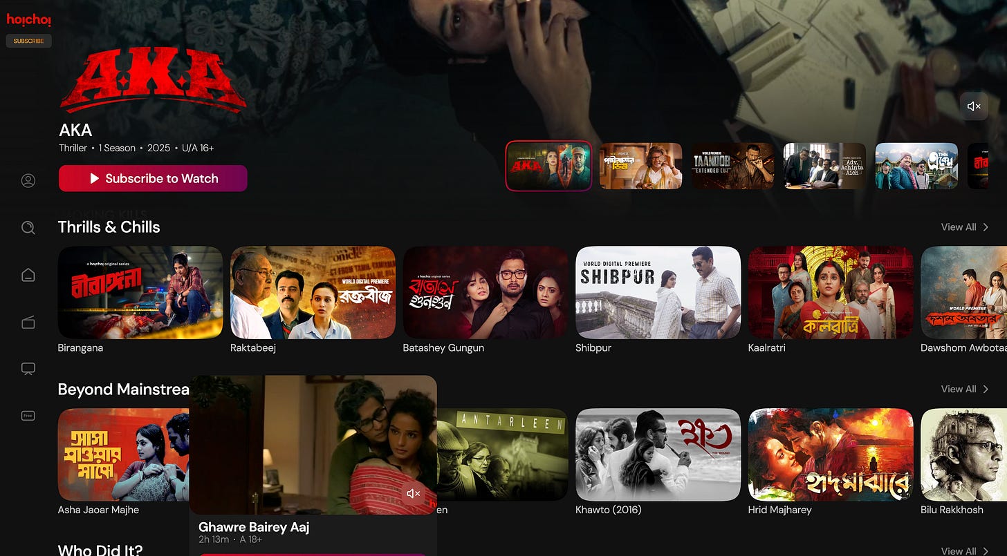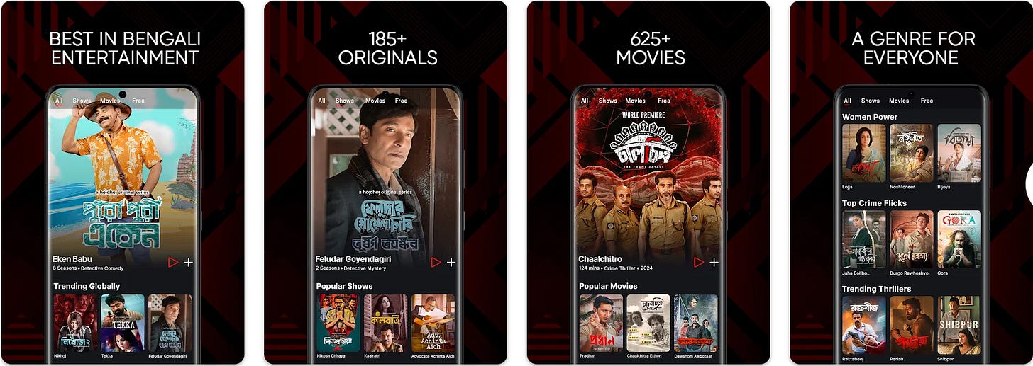 Hoichoi (launched 2017) has become the premier Bengali OTT service, boasting approximately 13 million subscribers across 100+ countries. It has achieved this reach by focusing singularly on Bengali content and diaspora audiences. The platform offers a vast library of 600+ movies and 160+ original series, including popular detective thrillers and social dramas that enjoy completion rates as high as 80%. Co-founded by SVF (a major Bengali studio), Hoichoi leverages a steady pipeline of Bengali films and originals – even launching its own film production arm Hoichoi Studios to produce theatrical films that later stream on the platform.