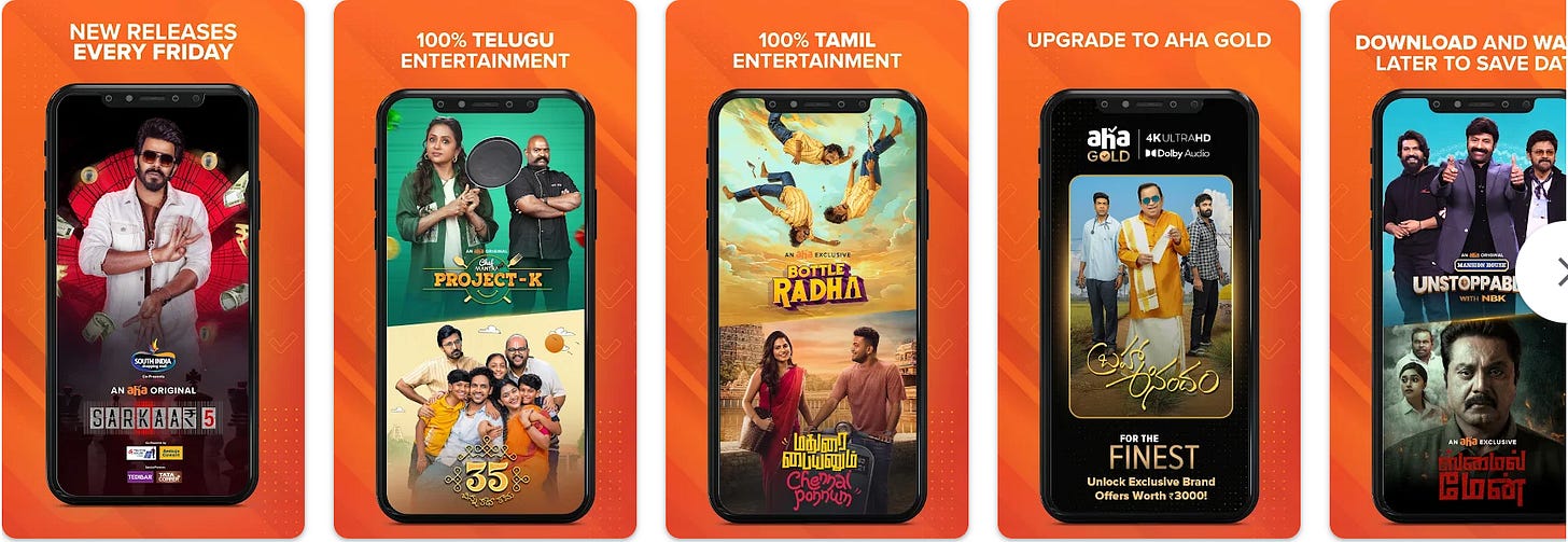 On the scripted side, Aha’s original web series like Kotha Poradu (rural drama) or Locked (thriller) and direct-to-OTT movies (Color Photo, etc.) have resonated well. 70% of Aha’s content budget is dedicated to originals (Telugu and Tamil), underlining its belief that unique local content is key to retention. The service keeps pricing affordable for mass appeal – annual plans around ₹399-699 and quarterly mobile-only packs under ₹150 – far cheaper than global OTT subscriptions. This low ARPU is offset by scale and high engagement in its target states. To extend its reach further, Aha has pursued aggressive bundling and partnerships: for example, it joined the Airtel Xstream aggregator in late 2023, instantly getting exposure to Airtel’s 5+ million bundle subscribers. (Airtel’s OTT pack now carries Aha’s Telugu and Tamil catalogs alongside bigger platforms, expanding Aha beyond its direct subscriber base.) Likewise, Aha is offered on OTTplay Premium and other super-aggregators, and it frequently partners with cable and fiber broadband operators in South India for bundled deals.